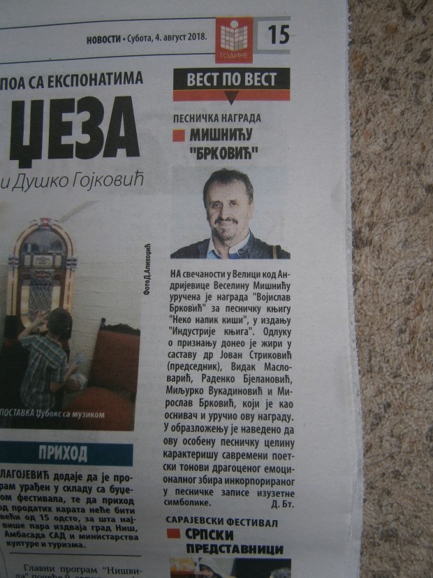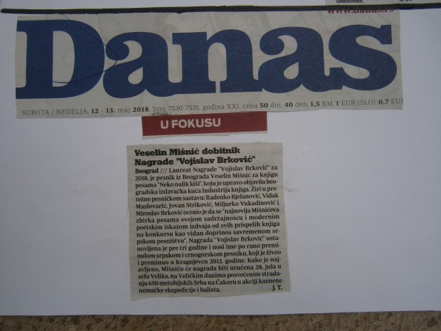 Veselinu Mišniću, književniku iz Beograda, (28. 07.2018 god,) svečano uručena književna nagrada VOJISLAV BRKOVIĆ, u Velici, kod Andrijevice, Crna Gora. Obrazloženje žirija, koji su činili Dr Jovan Striković (predsednik) Vidak Maslovarić, književnik i književni kritičar, Radenko Bjelanović, pesnik, Miljurko Vukadinović, pesnik i Miroslav Brković, utemeljivač i sponzor nagrade, pročitao je knjižćevni kritičar i član žirija Vidak Maslovarić. Nagradu je ovogodišnjem dobitiniku Veselinu Mišniću u iznosu od 1000 evra, uručio osnivač u sponzor nagrade, vlasnik kompanije Brković- nekretnine iz Kragujevca, gospodin Miroslav Brković.